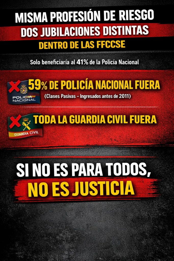 Según nuestras estimaciones, esta regulación dejaría fuera aproximadamente al 59% de la plantilla de la Policía Nacional, es decir, a los compañeros que ingresaron antes de 2011 y cotizan en Clases Pasivas.
